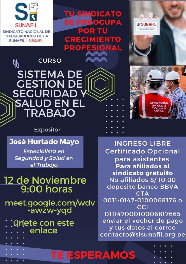 Estimado afiliado porque nos preocupamos por tu capacitación constante realizaremos una charla de seguridad y salud en el trabajo TOTALMENTE GRATUITA. Permítenos ayudarte en tu preparación para los próximos concursos de la SUNAFIL.